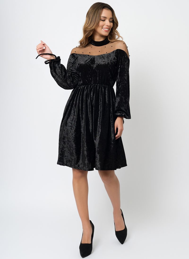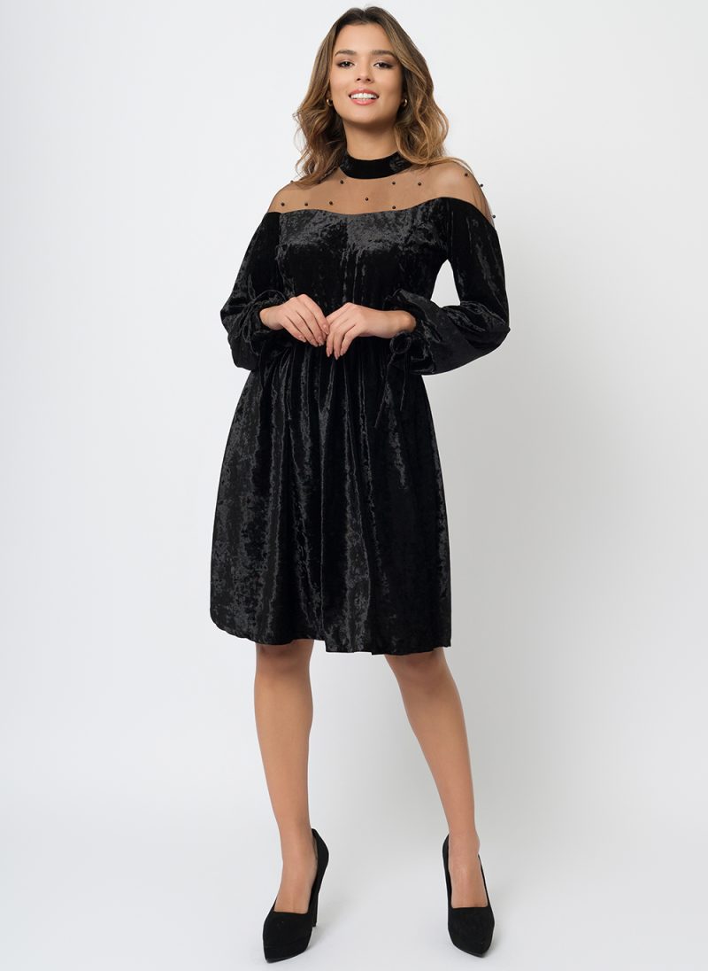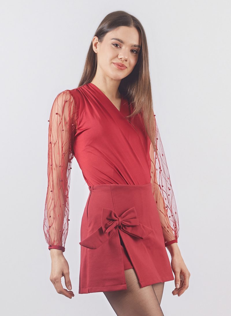Pieza que combina sofisticación y modernidad en una silueta slim fit que resalta la figura. Confeccionado en 100 % poliéster, incorpora mangas largas en tul bordado con detalle de perlas, que aportan un toque delicado y elegante. Desde los hombros hasta la cintura, sutiles pliegues diagonales corrugados estilizan el torso, creando textura y un efecto visual favorecedor. Una pieza versátil y refinada, ideal para transformar tanto looks casuales como de noche.