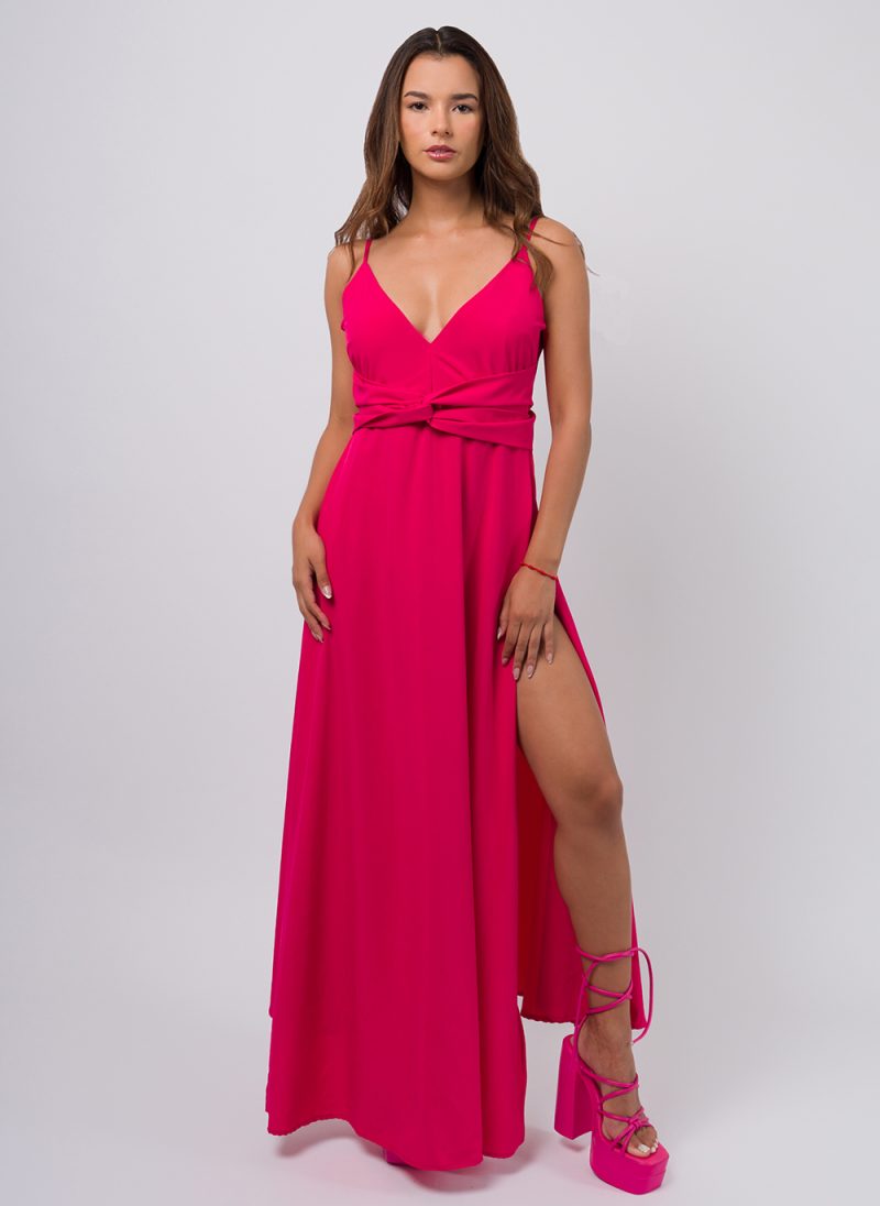 Vestido confeccionado en una bella seda, es una pieza elegante de silueta larga que deslumbra por su caída fluida. Presenta un escote en V con detalle entrelazado tipo lazo que realza el diseño con sutileza femenina. Las aberturas delanteras aportan movimiento y un toque sofisticado de sensualidad.