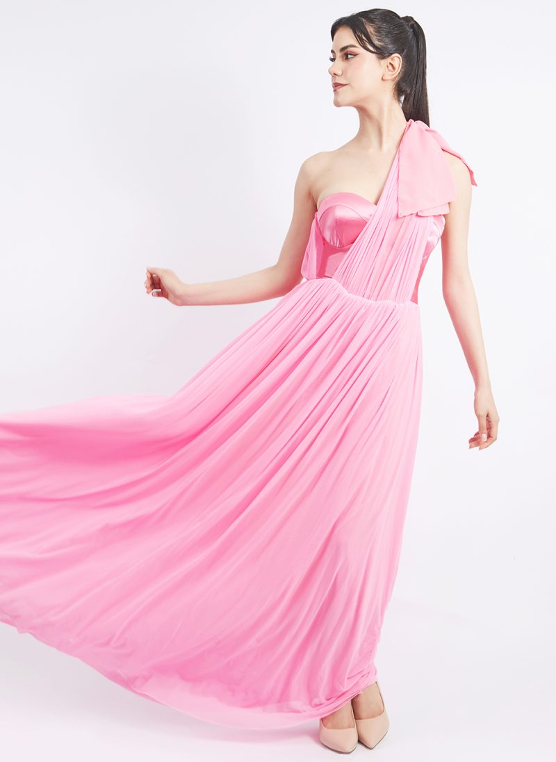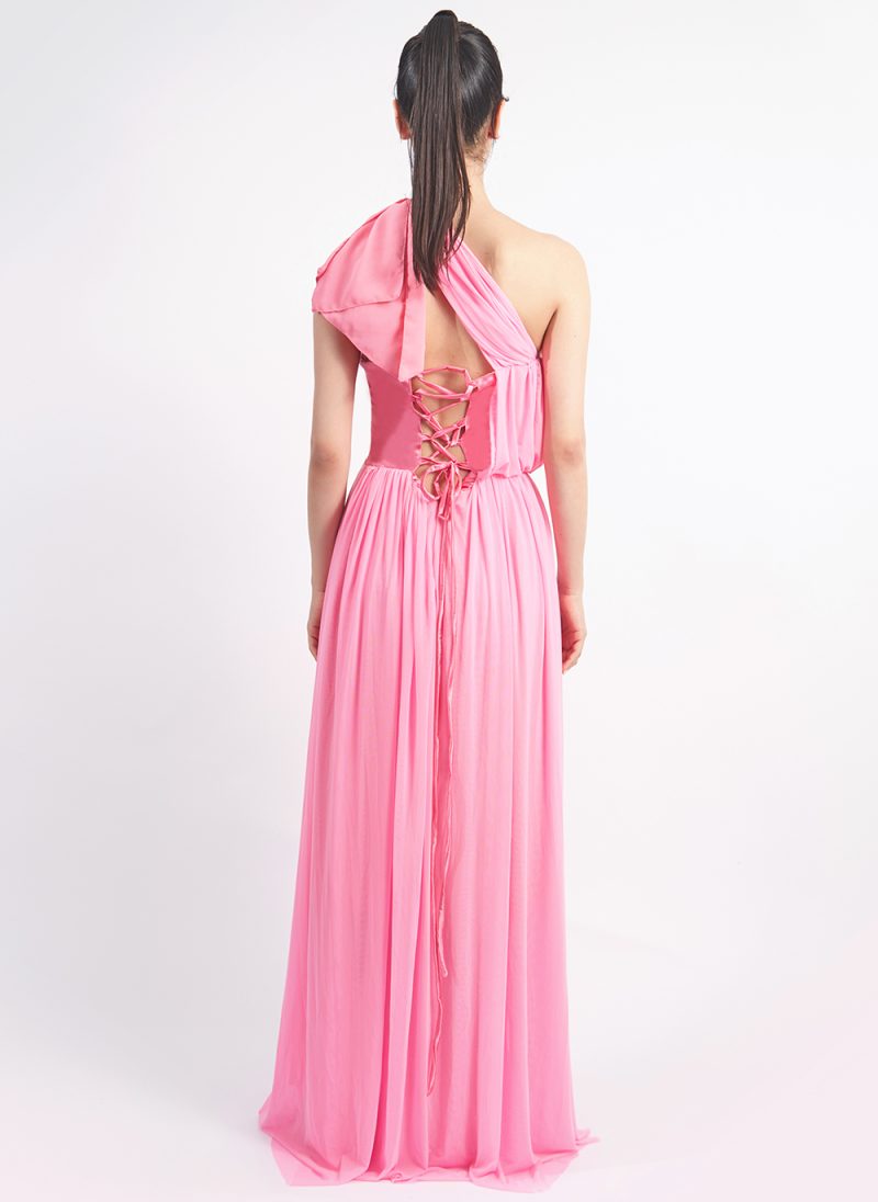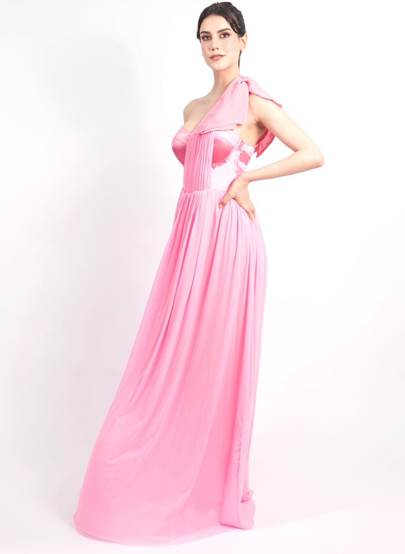 El diseño incorpora un cuerpo tipo corsé estructurado con varillas internas, diseñado para definir y estilizar la silueta con soporte firme. Sobre esta base estructurada se integra un drapeado asimétrico en tul que forma el escote de un solo hombro, aportando un efecto romántico y sofisticado. La falda es de corte amplio con caída vaporosa, compuesta por capas de tul que generan volumen ligero y fluidez al caminar.