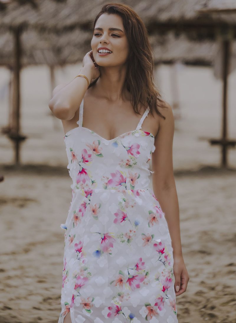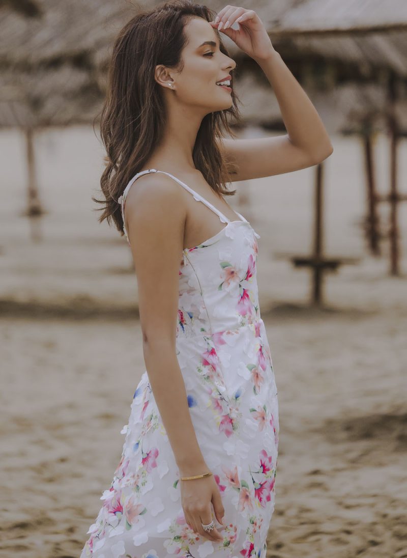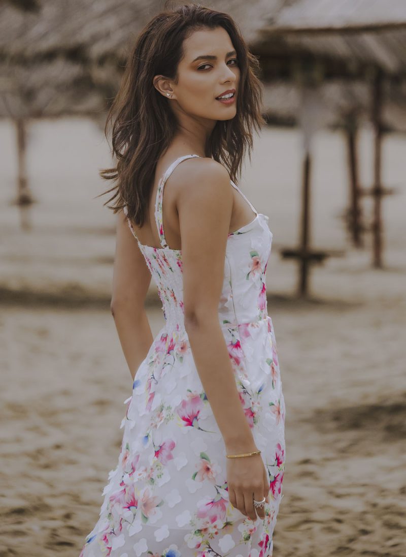 El Maxi Vestido Brisa , está confeccionado en una gasa ligera con textura de flores en efecto 3D, que combina romanticismo y modernidad en cada detalle.