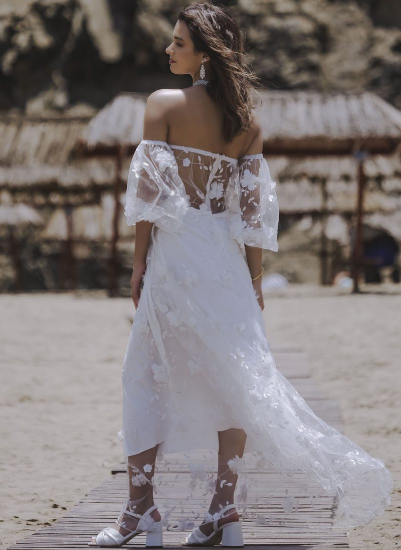 Incluye mangas abullonadas desmontables, confeccionadas en el mismo tul bordado con flores 3D. Estas mangas son removibles, lo que te permite transformar tu look según el momento.