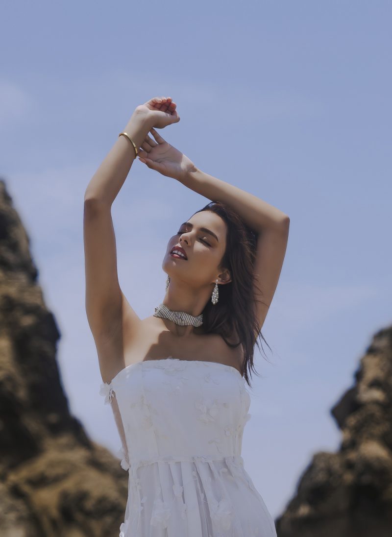 Confeccionado en un tul liviano y vaporoso, el Nayeli destaca por su corte en línea A con caída suave y movimiento fluido. Su falda tiene un doble largo: un forro liso que llega a media pierna y una sobrefalda larga en tul bordado 3D que se extiende hasta el tobillo, creando un efecto etéreo y elegante al caminar.